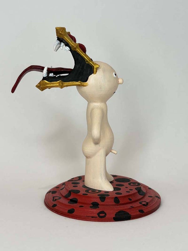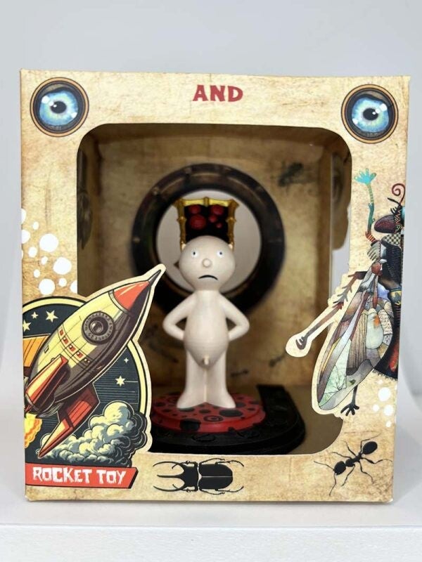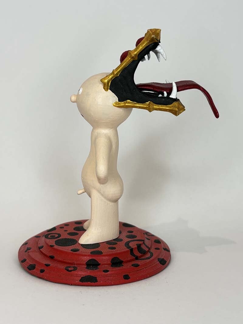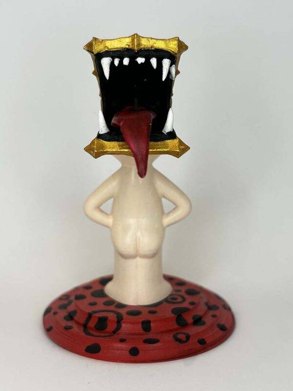 Ar Toy Pi se encuentra totalmente desnudo con un sombrero que tiene aspecto de monstruo con las fauces abiertas. Este sombrero parece un libro ¿Lo será?, mientras que es en la parte trasera donde se aprecia esta criatura con lengua bífida. Dimensiones aproximadas, varían según modelo.