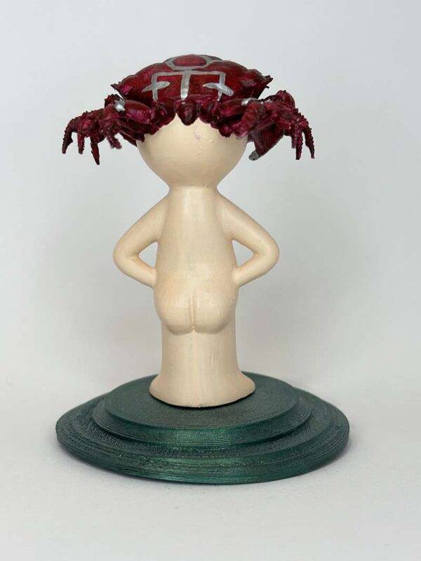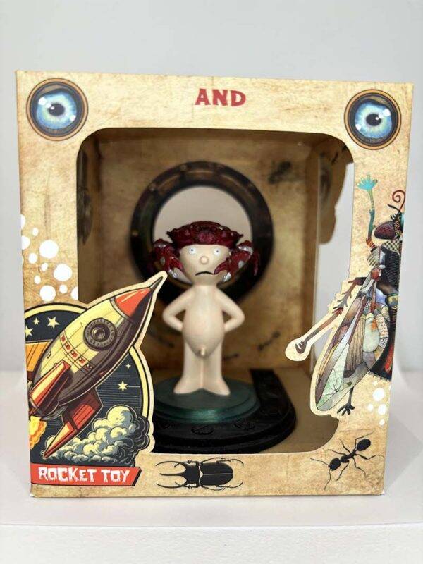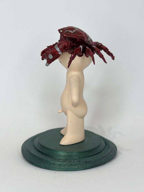 Art Toy Pi cangrejo mira el escaparate de una pastelería, lleva un gorro de cangrejo, que le hace pasar desapercibido entre los demás hombres cangrejos.